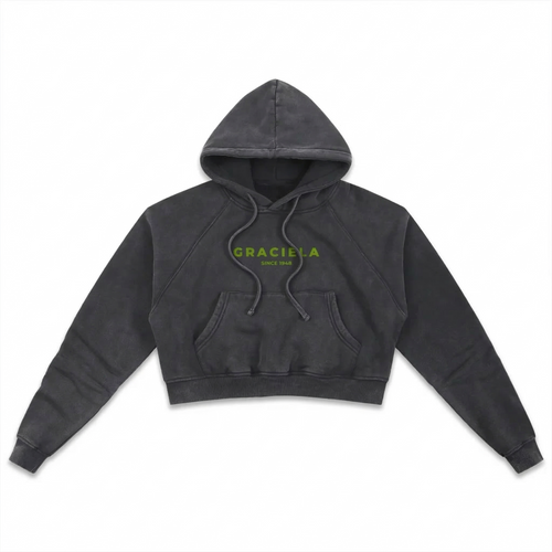 Cropped sweatshirt cut from heavyweight fleece with an acid-wash finish that gives each piece a slightly varied, lived-in surface. Built with a relaxed, boxy silhouette, dropped shoulders, and a raw-cut hem that hits just above the waist. Ribbed crew neck and cuffs. Finished with a center-chest logo print.